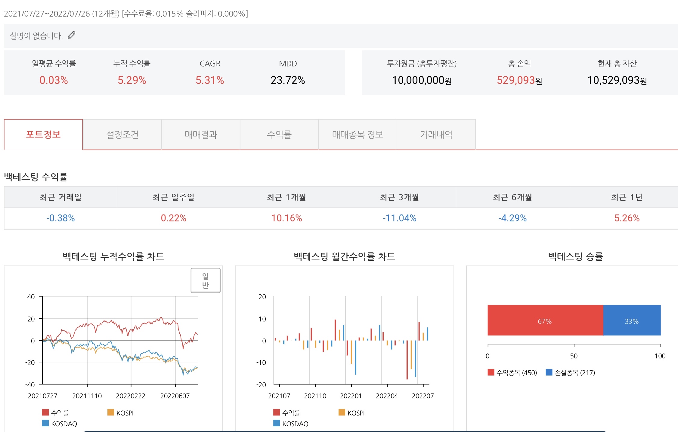 6주전 즈음에 공개한 급등주 매매전략 만들기에서 제공한 샘플전략이 마켓타이밍을 적용하지 않은 것인데 6주가 더 지난 지금 최근 일년간의 백테스트를 다시 해보니 연수익률이 19.5% 에서 5.59%로 많이 무너져있다.