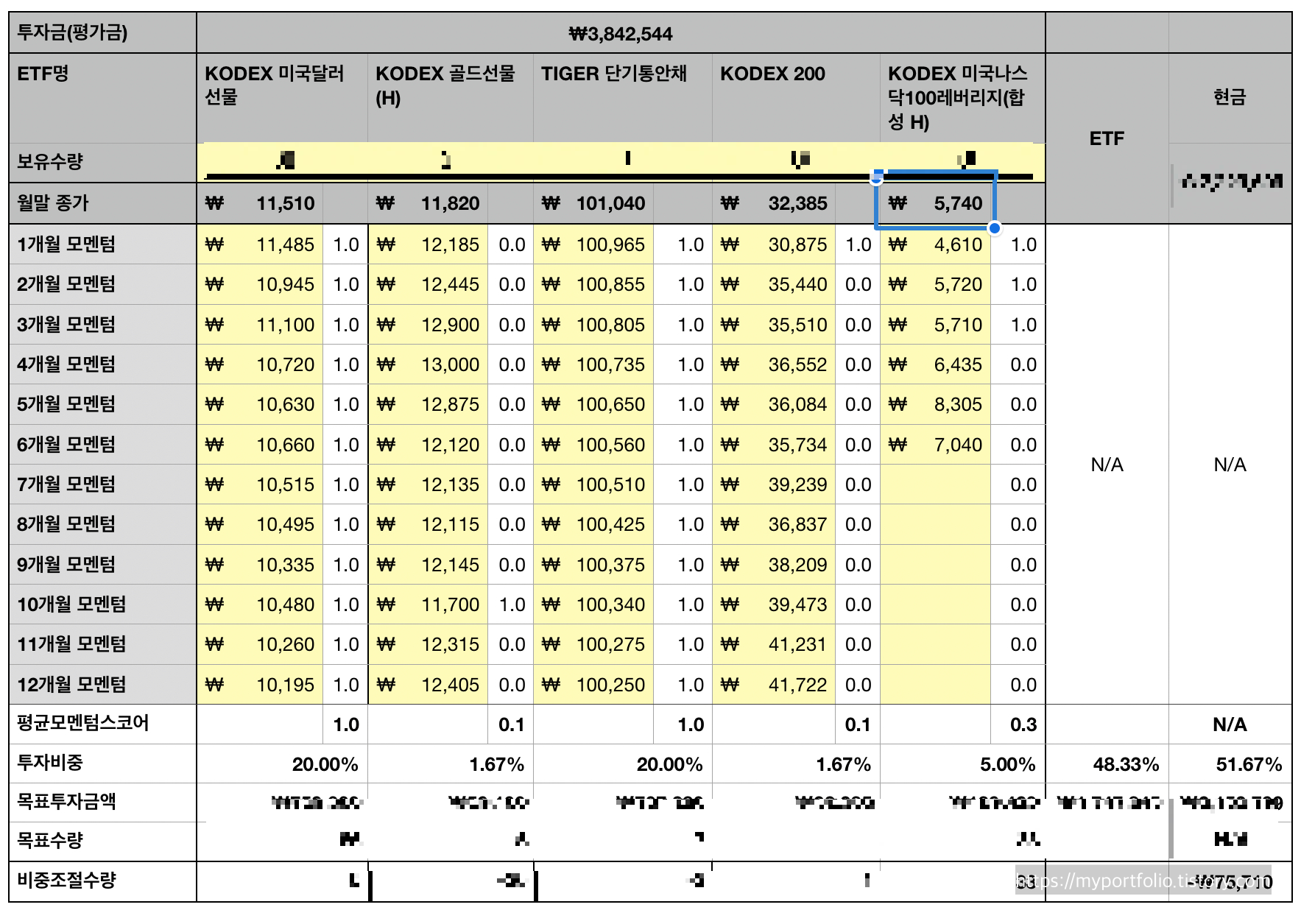 KODEX 골드선물(H), KODEX 미국나스닥100 레버리지(합성 H), TIGER 단기통안채, KODEX 200 4종목으로 포트폴리오를 구성하여국내상장 ETF 투자를 시작한지 두달이 되었다. 7월에는 포트폴리오에 KODEX 미국달러선물을 추가하여 총 5종목으로 리밸런싱하여 운용중이다.
