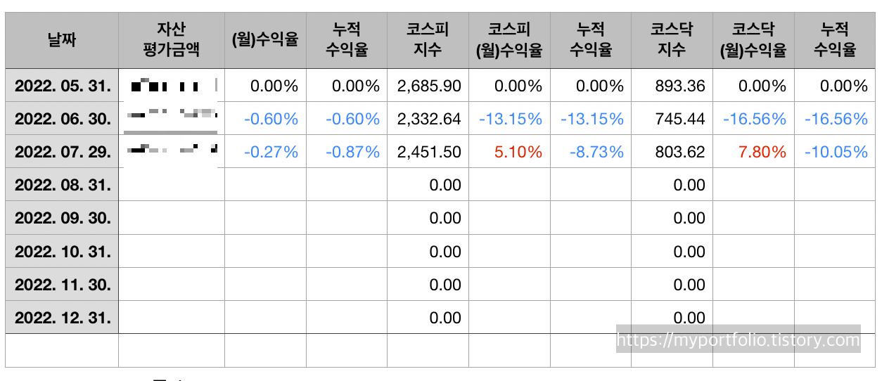 지난 6월부터 시작한 평균모멘텀스코어 방식의 포트폴리오 투자가 정확히 한달이 되었다. 한달간 코스피 지수는 -13%, 코스닥 지수는 -17% 하락하였다. 금일 장마감 후 결산해보니 내 포트폴리오