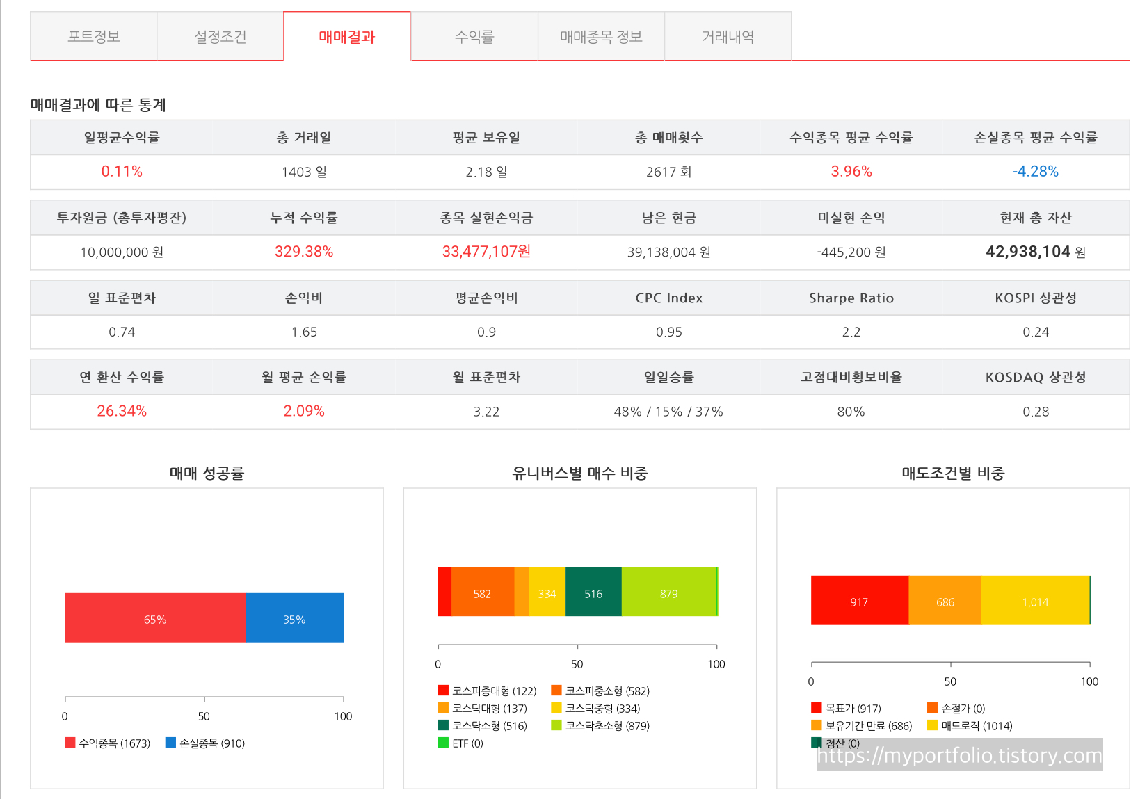 위 전략에 따른 틱 백테스트 결과는 아래와 같다. 2017년 이후 5년8개월의 누적수익률 329%, 승률 65%, 유니버스별 매수비중도 적절히 분산된 꽤 괜찮은 결과를 보여준다. 특히 2022년 역대급 하락장에서도 좋은 수익률을 기록하고 있음을 알 수 있다.