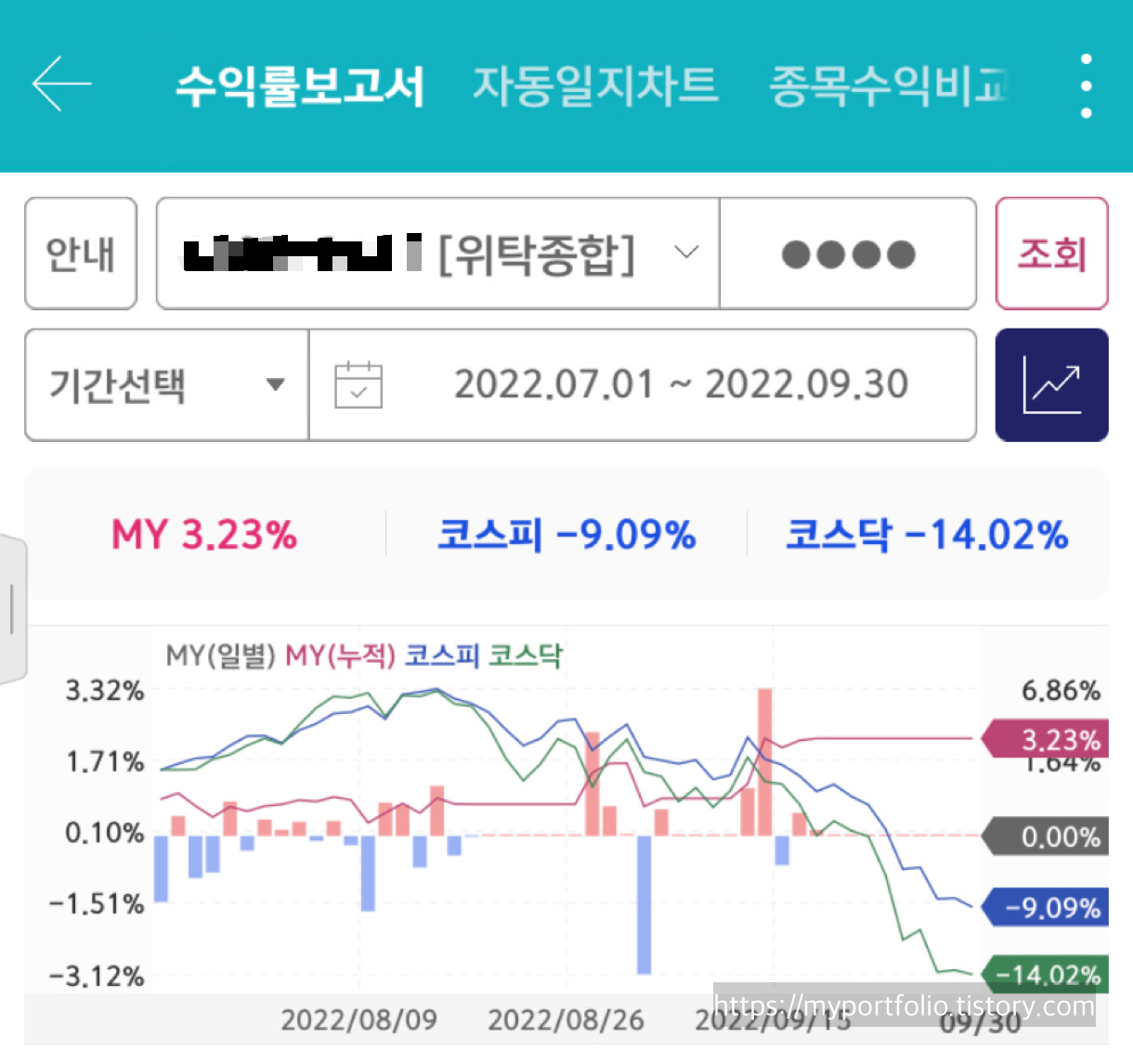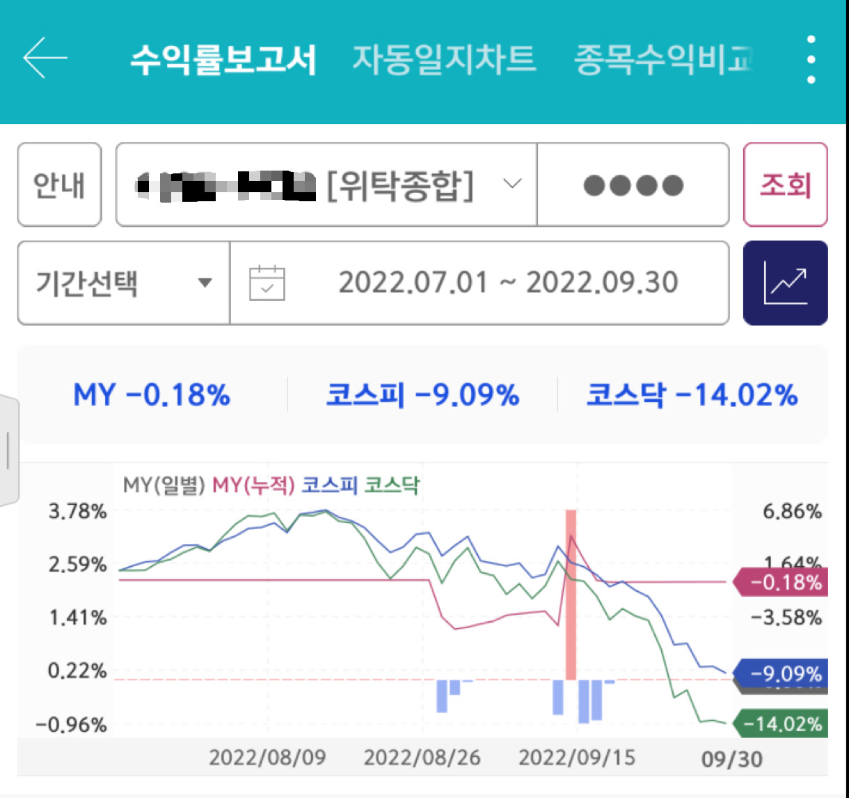 지난 3달간 중간에 잠깐의 베어마켓 랠리 후에 9월 내내 하락장이 이어졌음에도 국민MT인 코스닥 마켓타이밍 덕에 수익률은 나름대로 잘 방어하고 있고 9월에는 마켓타이밍이 여러차례 발동되어서 거래일이 5일 밖에 되지 않을 정도로 시장이 매우 않좋은 상태이다.