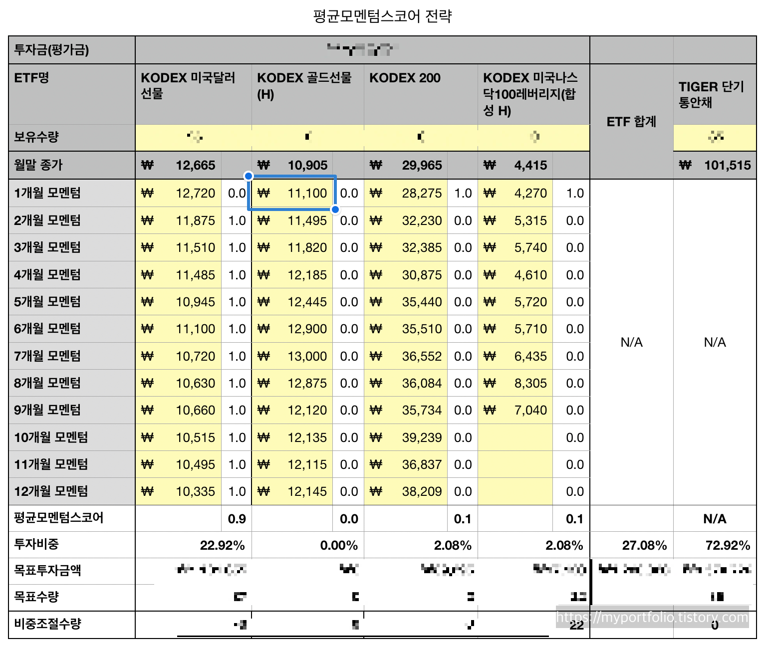 10월 주식시장은 전달 대비 코스피와 코스닥 시장 각각 +6.41%와 +3.37% 상승하며 마감하였다. 9월말 종가 기준으로 KODEX 미국달러선물(H)과 TIGER 단기통안채를 25:75 의 비율로 리밸런싱하였는데 10월 초에 100만원 정도 증액을 하고 다시 동일한 비율로 매수하였다. 지난 한달간 개별 종목들의 추세는 KODEX 미국달러선물(H)의 1개월 모멘텀 하락으로 10월 마지막 날인 오늘 종가 기준으로 비중이 25% → 23%로 축소 되었고 KODEX 200과 KODEX 미국나스닥100레버리지(합성H)는 한달간 모멘텀 상승으로 각기 2.08%씩 신규 진입하게 되었다. 주가가 상승으로 전환하면서 상대적으로 환율은 떨어진 결과다.