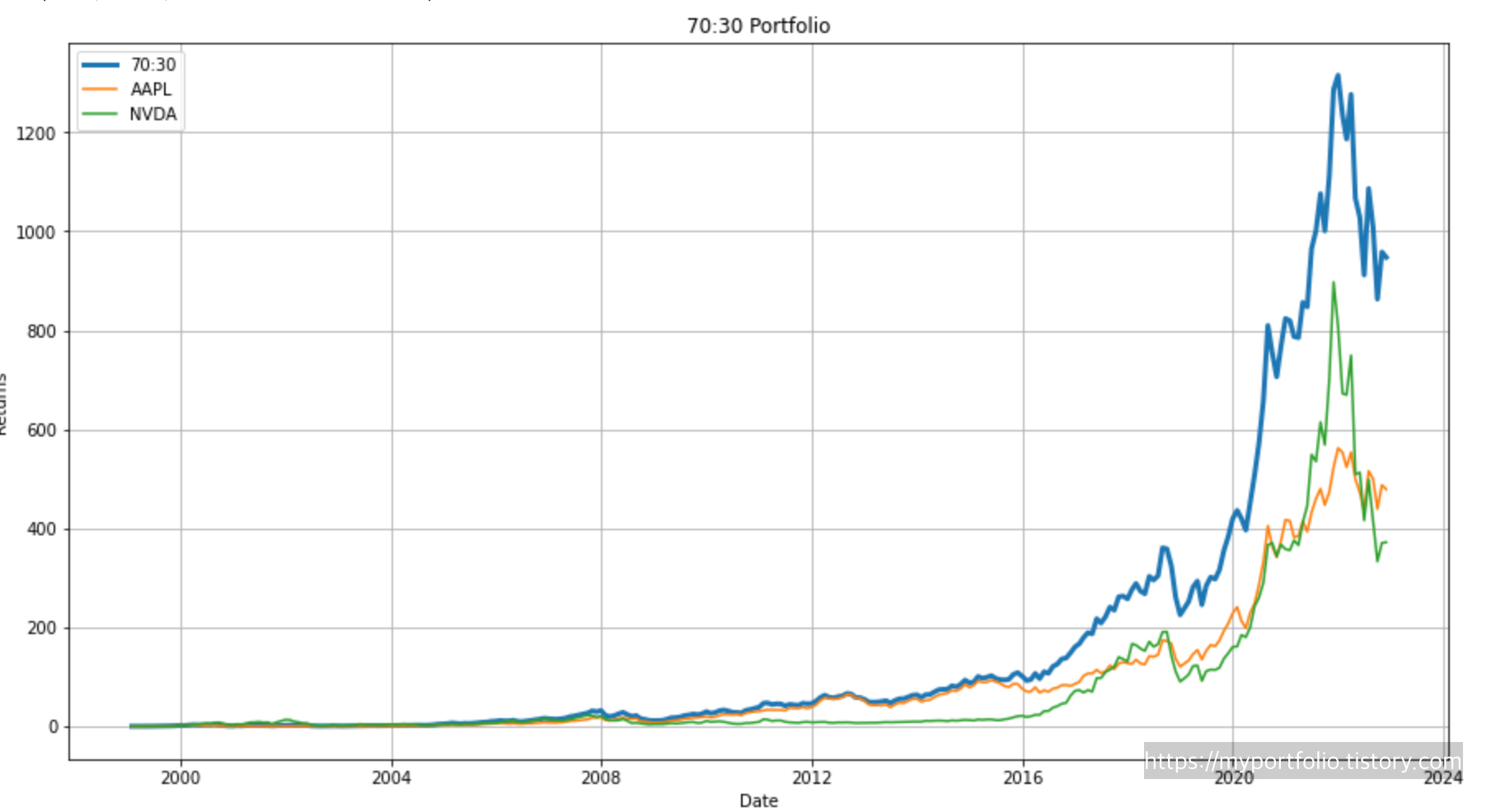 위 결과는 과거 20여 년간의 각 개별종목들의 수익률과 변동성을 기초로 해당 종목으로 구성된 포트폴리오의 변동성 대비 기대수익률을 최대로 하는 비중을 의미한다. 실제 위와 같은 비중으로 과거 20여 년간을 백테스트 한다면 수익률이 어떨까? 궁금해진다. 마이크로소프트의 비중은 매우 작기에 무시하고 애플과 엔비디아의 비중을 70:30 고정 비중으로 하고 월 단위 리밸런싱을 수행하는 백테스트를 해보았다. 결과는 아래와 같이 무려 900배 이상의 수익율을 보여준다. 물론 과거의 데이터로 뽑아낸 최적의 비중이 앞으로도 적중하리라는 보장은 없지만 놀랍긴하다.