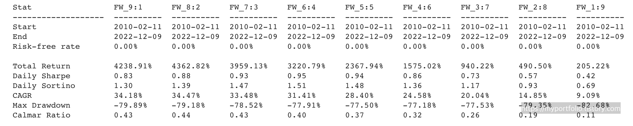 이제 TMF와 일정 비율을 혼합한 전략의 결과를 살펴본다. TQQQ vs TMF의 비중을 9:1 ~ 1:9 로 바꿔가며 백테스트를 수행하였다