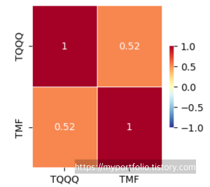 위 보글헤드에 올라온 원문은 UPRO 와 TMF를 4:6으로 혼합한 전략을 테스트를 하였으나 난 앞으로 TQQQ와 TMF를 가지고 백테스트를 수행해 볼 것이다. 먼저 상관계수를 보면 아래와 같다.