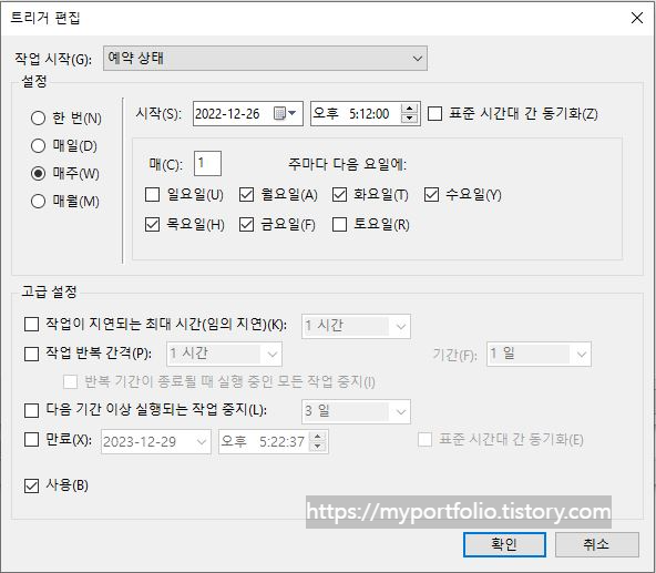 새 작업 만들기는 5개의 탭으로 구성되어 있는데 일반적으로 첫 3개의 탭만 잘 설정하면 무리없이 작업이 예약된다. 먼저, 일반 속성 탭에서 작업의 이름을 정의하고 보안옵션을 적절한 것으로 선택한다. 그리고 두번째 트리거 탭에서는 작업을 언제 또는 어떤 주기로 실행할 지를 결정한다. 나의 경우는 15시30분에 정규시장 종료전까지는 젠포트 자동매매 시스템에 영향을 주면 안되기 때문에 아래와 같이 평일에만 장종료 이후 여유있는 시간으로 설정했다.