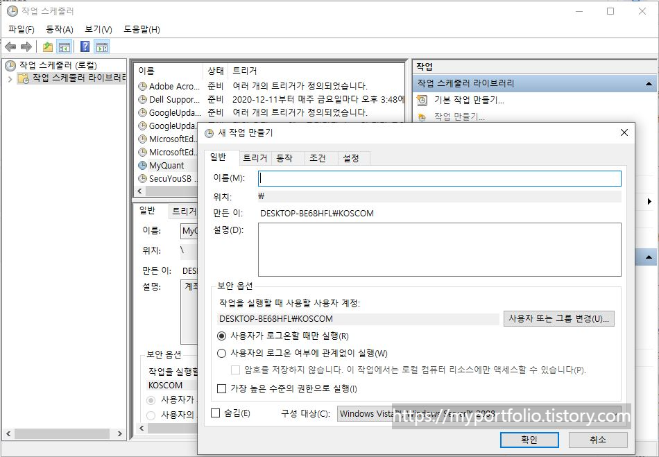 결국 하루에 한번만 접속해서 평가금과 잔고를 갱신하는 것으로 정하였고 이를 위해서 Window 환경에서 제공하는 작업 스케줄러를 사용하였다. 먼저 작업 스케줄러를 실행하고 작업 만들기를 선택한다.