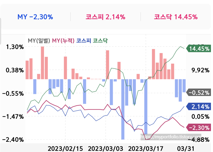 2023년 2~3월 두달간 코스피 시장은 -0.27% 하락했고 코스닥 시장은 14.33% 로 강한 상승을 하였다. 소형주 퀀트전략을 운용하는 사람에게는 지난 두달 동안 달콤한 꿀을 빨았을 듯 싶다. 하지만 내가 운영중인 2개의 추세 추종 전략의 지난 두달간의 성과는 좋지 못했다. 한개는 -2.30% 로 마이너스 수익률을 기록했고 다른 하나는 +4.24% 정도의 수익을 보았다.