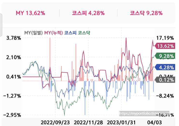 코스닥 시장에서 지난 1월부터 시작된 소형주 위주의 강한 장세의 혜택을 받지 못한 결과로 생각된다. 다만 작년 6월부터 시작한 이후의 10개월간의 누적수익률은 나쁘지 않으나 전반적으로 수익률의 변동이 너무 심한 듯하다. 전략을 조금 더 손을 봐야하나 고민스럽다.